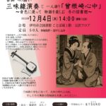 今回は「古典のへの誘い」と題しまして、三味線の音色を楽しんでいただくとともに、元禄文化を代表する近松門左衛門作『曽根崎心中』を一人語りでご紹介させていただきます。