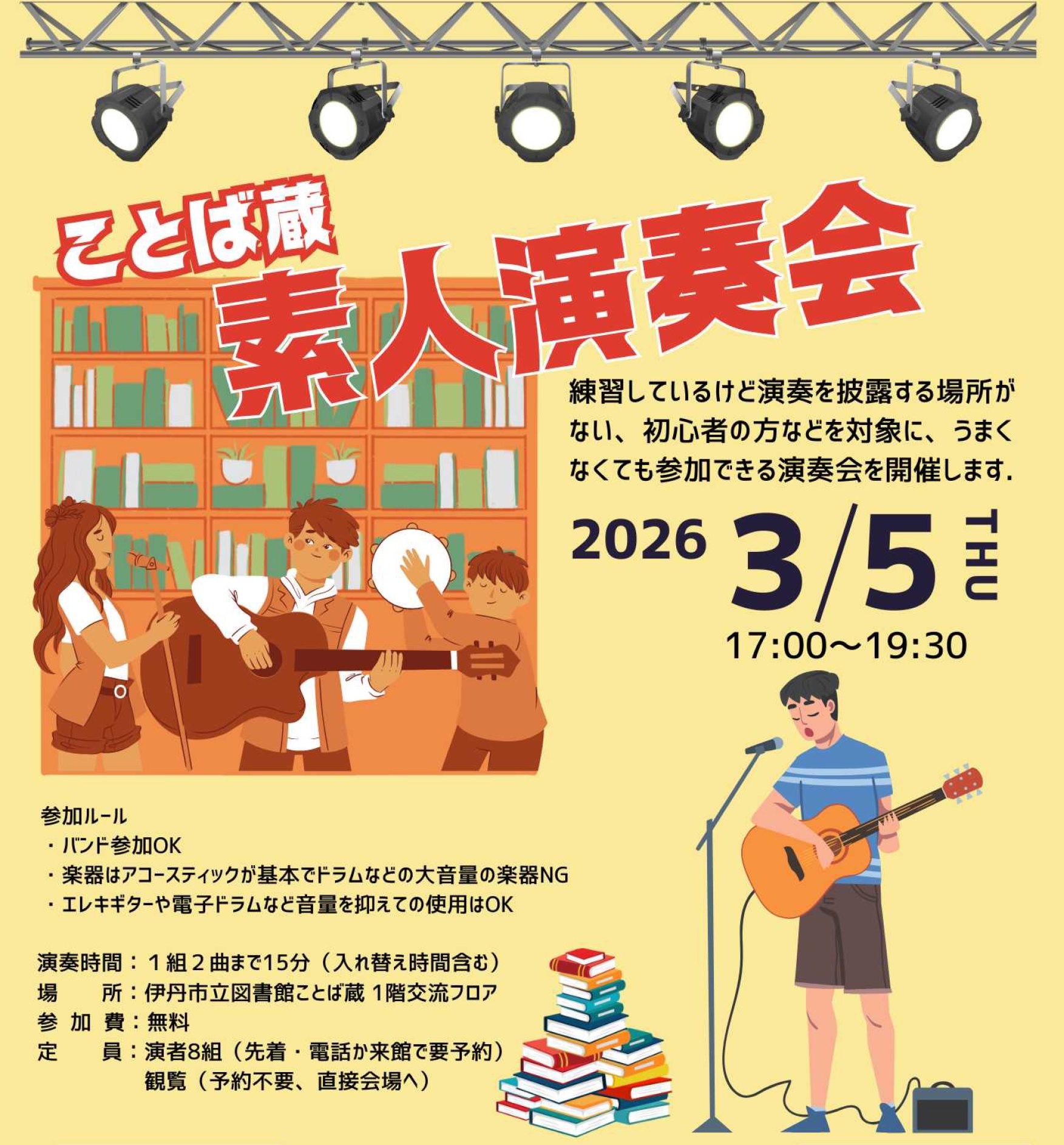 練習しているけど演奏を披露する場所がない、初心者の方などを対象に、うまくなくても参加できる演奏会を開催します。