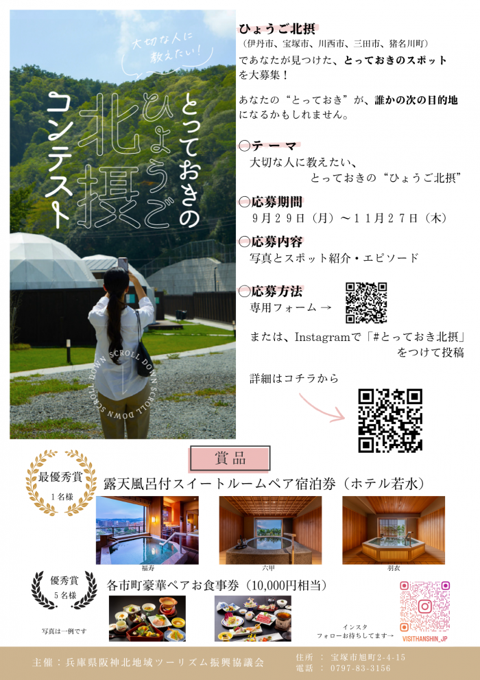 ひょうご北摂の地域資源に光を当てるため、自分だけが知っているとっておきのスポットを大募集するコンテストを初開催!専用フォームまたはInstagramからご応募ください。魅力的なスポットをご紹介いただいた方には、露天風呂付スイートルームペア宿泊券など豪華賞品をプレゼントします。