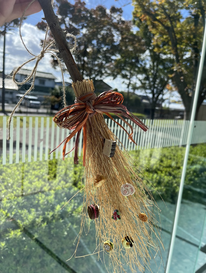 キッチンカーイベント会場にて、園内で育てたコキアに、パーツを付けていきます。