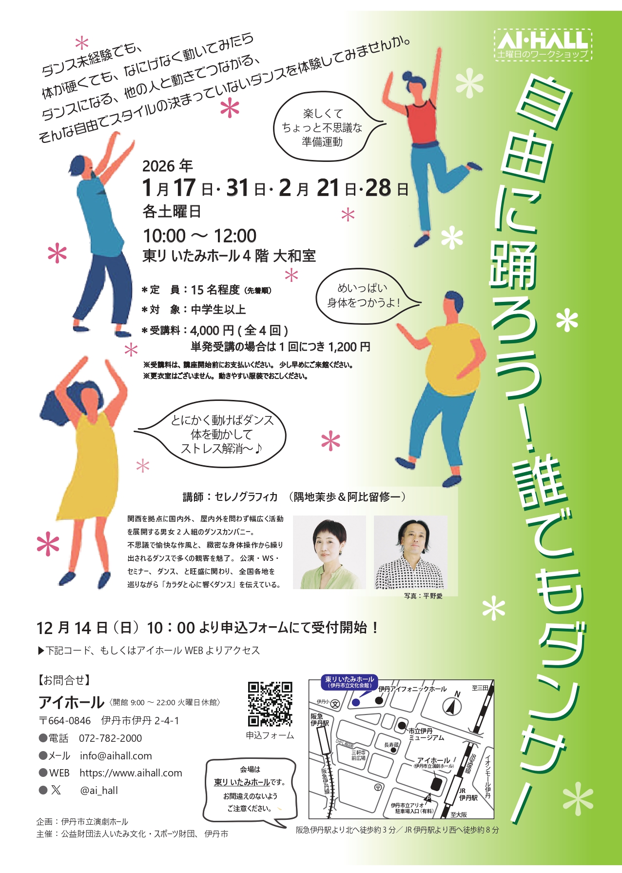 関西を拠点に活躍する男女2人組ダンスカンパニーによる初心者向けダンス講座が登場です。 ダンス未経験でも、体が硬くても、なにげなく動いてみたらダンスになる、他の人と動きでつながる、そんな自由でスタイルの決まっていないダンスを体験してみませんか。