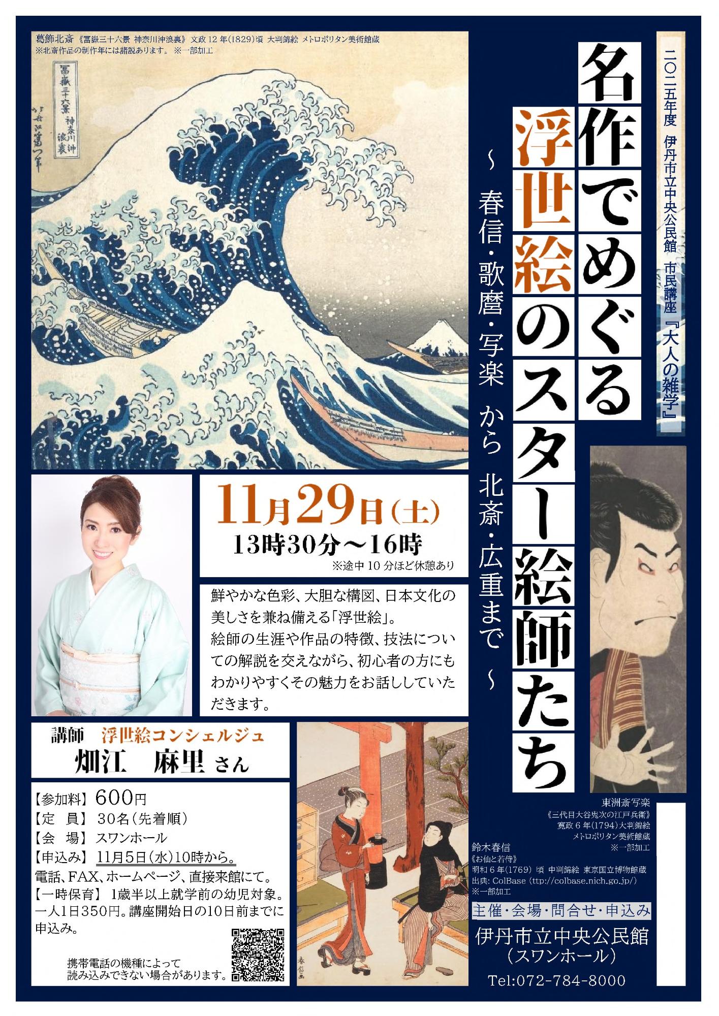 鮮やかな色彩、大胆な構図、日本文化の美しさを兼ね備える「浮世絵」。絵師の生涯や作品の特徴、技法についての解説を交えながら、初心者の方にもわかりやすくその魅力をお話ししていただきます。