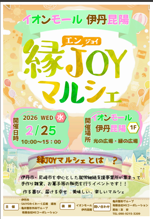 伊丹市を中心とした阪神間の障がい者就労継続支援事業所が集まって、手作り雑貨やお菓子の販売を行うイベント「縁JOYマルシェ」を開催します。