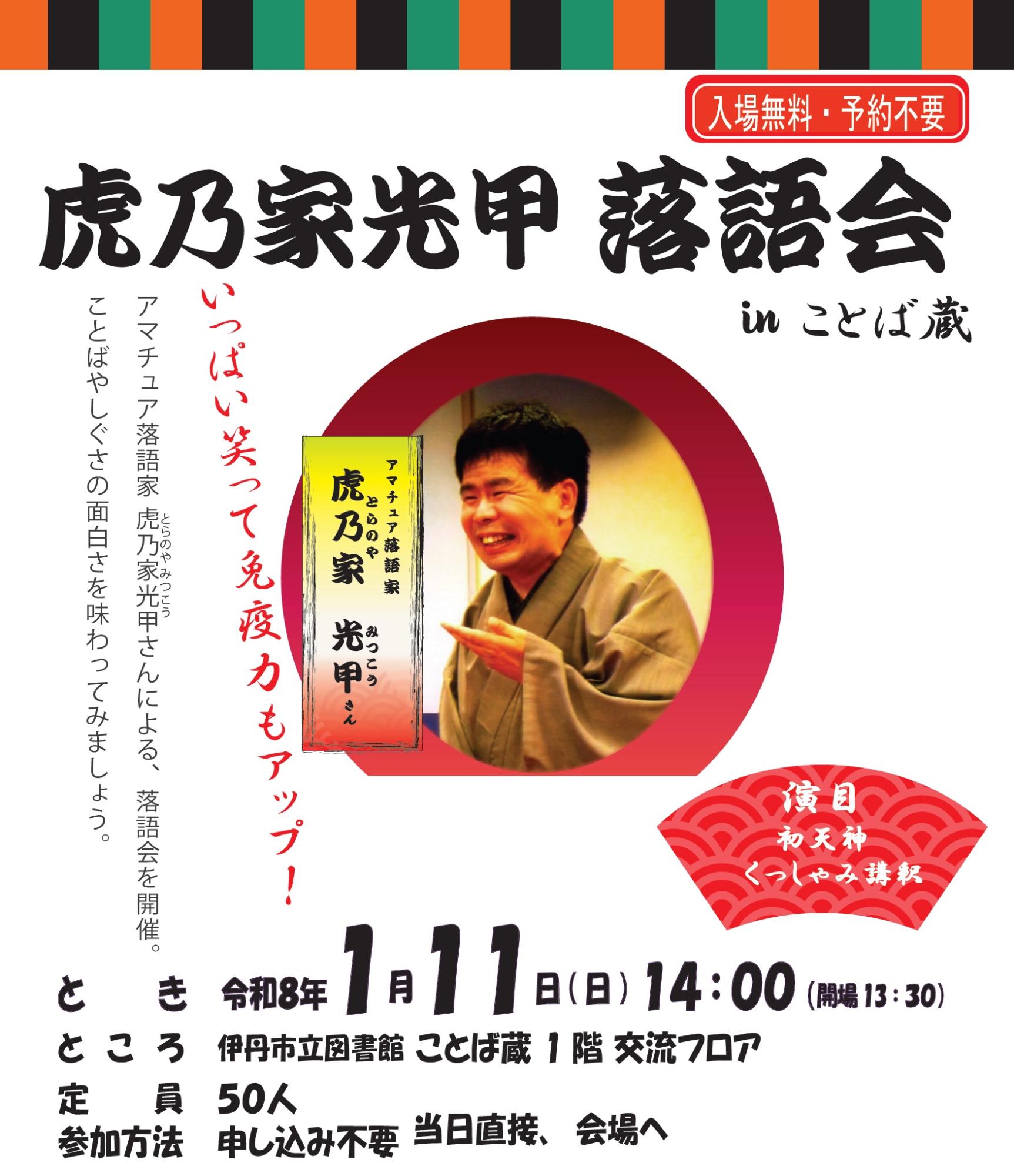 アマチュア落語家虎乃家光甲さんによる、落語会を開催。言葉やしぐさの面白さを味わってみましょう。いっぱい笑って免疫力をアップさせよう!