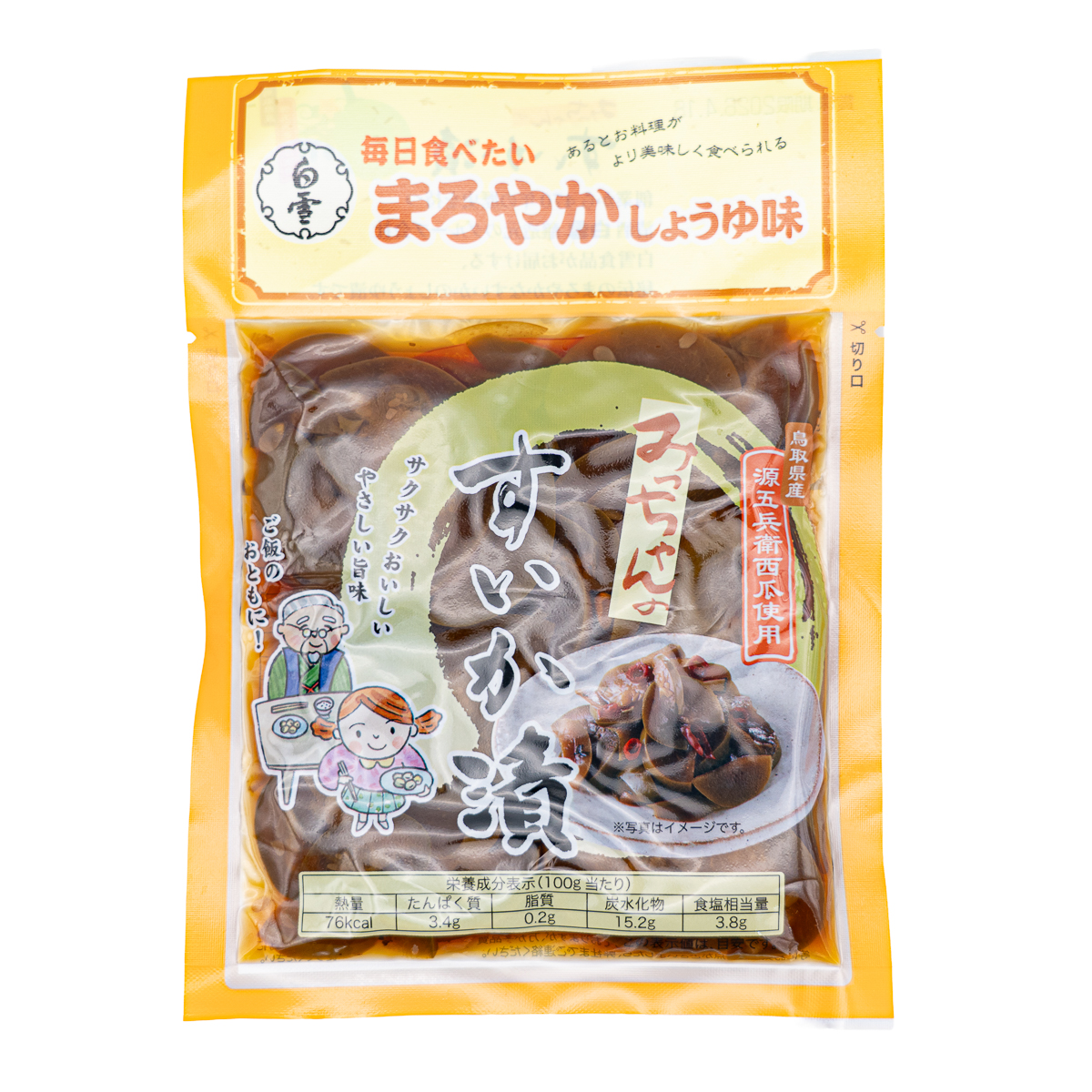 鳥取県産の「源五兵衛西瓜」を、やさしい旨味の醤油だれでまろやかに漬け込みました。お漬物専用に育てられた幼果すいかならではの、サクサクとした歯ごたえと、小さな種のプチっと弾ける食感がクセになる一品です。