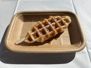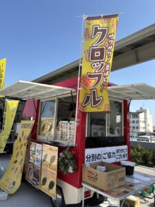 会場にはオシャレなキッチンカーや飲食コーナーもあり、みなさん食事も楽しみながらゆっくり過ごされていました。私達もクロッフルを頂きましたが、焼きたてでとても美味しかったです。お昼過ぎには抽選会も行われました。私達ローズメイトもくじを引いたり、景品をお渡しするお手伝いをさせて頂きました。蘭などの綺麗なお花やお米やお野菜など、とても魅力的な景品ばかり用意されていました。